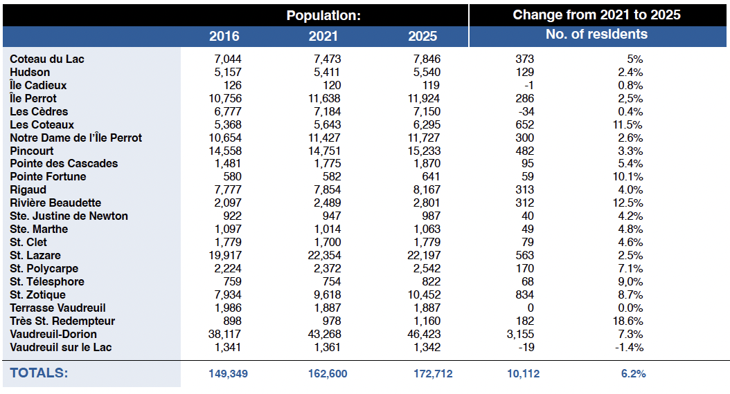 The population of the Vaudreuil-Soulanges region has increased by 6.2 per cent in the last five years, with the largest city in the area, Vaudreuil-Dorion, seeing the biggest jump in the number of residents, according to the latest numbers released by the provincial government.